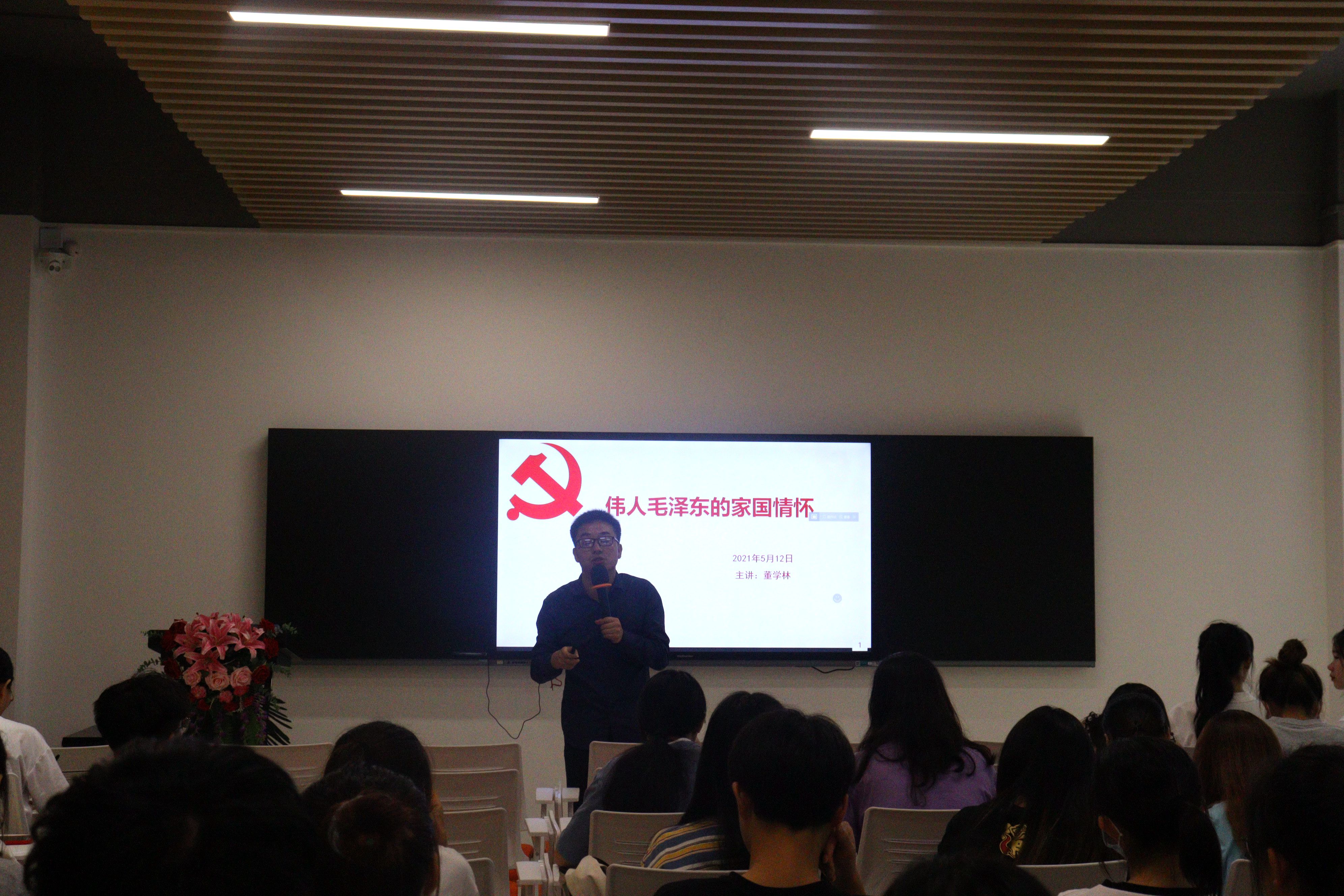 主讲人董学林老师以伟人毛泽东的家国情怀为主题,为我们讲述了毛泽东领导中国人民彻底改变个人命运和国家面貌的实际行动和伟大壮举。内容主要分为三个部分,第一部分讲述毛泽东志存高远的爱国情怀;第二部分讲述毛泽东舍家卫国的奉献情怀;第三部分讲述新时代党员的新情怀。在主讲过程中,董学林老师以具体例子和视频分享让同学们进一步了解毛泽东伟人事迹,同学们仔细聆听,认真记录,营造出学党史的浓厚氛围。