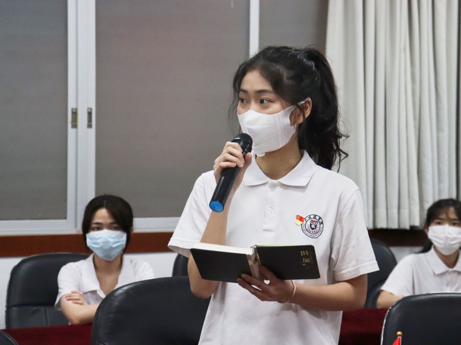 第四位朗读者,是来自2020级的张炯莹,她向我们朗读的是《陈觉与赵云霄的诀别信》。通过她的朗读,我们深入理解了“舍小家,为大家”的内涵,这一句话在陈觉与赵云霄中表现得淋漓尽致,陈觉与赵云霄在面对国家需要与家庭需要时,毅然选择了为国献身,真正体现出一名党员的责任与使命!