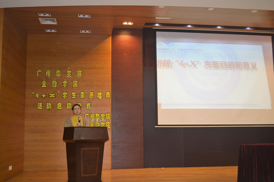 首先由党总支书记张雪梅讲话,她从指导思想、实施原则、实施内容三个方面对“4+X”员工素质培养方案进行介绍,强调同学们应该努力培养四项基本素质,即以责任担当为重点的思想品德素质、以诚信守法为重点的法律素养、以合作创新为重点的创新创业素质和以坚韧豁达为重点的身心素质。接下来团委书记叶剑敏为同学们介绍了“4+X”方案的实施方法,详细说明了社会实践学分的认定流程,进一步规范了学分的认定。