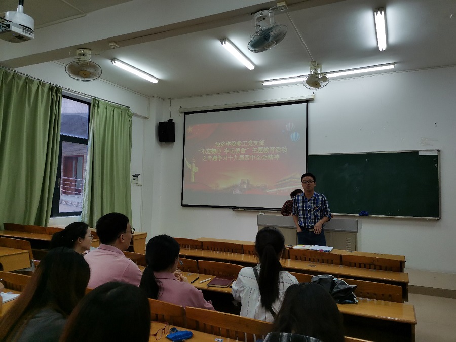 林书记从党的十九届四中全会的内容出发,首先对全会的精神作了高度而精准的概括和总结,一方面他肯定了我党在过去几十年尤其是改革开放四十年来所发生的巨变,见证了祖国一步一步从富起来到强起来的过程;另一方面,他呼吁广大教工党员同志们要通过不断的学习来深入理解“不忘初心、牢记使命”的精髓,并且各位党员同志要明晓我党在未来如何推进国家治理体系和治理能力现代化的战略规划,此外他还提出教工党员要保持高度的自觉,通过教书育人、自学推广和常态化学习来将党的十九届四中全会精神渗透到教学和科研的给各领域,各教工党员要对标身份和党性修养,除了积极进取,更要坚守初心,坚持将实现中华民族伟大复兴的中国梦作为一项世纪大工程来坚守,始终保持共产党员的先进性,并践行全心全意为人民服务的宗旨。