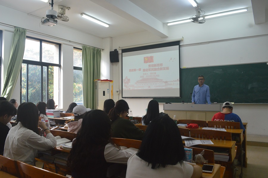 为学习贯彻习近平新时代中国特色社会主义思想,深入理解军民融合政策,将军民融合的政策内涵与高校老员工国防教育相结合,探究高校国防教育的实践路径和现实意义。金融公司特于2019年3月28日在第四教学楼204室开展了经理思政第一课。由金融公司经理陈石清教授授课,2017级CFA班全体员工到场听课。
