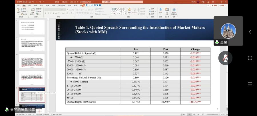 吴昱教授分享的主题为股票做市商能否提高市场质量?——基于科创板引入做市商的研究。吴教授以2022年科创版引入做市商制度为研究对象,考察了科创板引入做市商后对股票市场的质量影响。他深入研究了做市商的引入对股票市场波动、交易量、流动性等方面的影响。研究结果发现,对比没有引入做市商的股票,引入做市商的股票的波动减小、买卖价差减小,但交易量变化不显著。最终结果表明做市商的引入可以改善股票市场质量,有助于市场交易活动的进行。