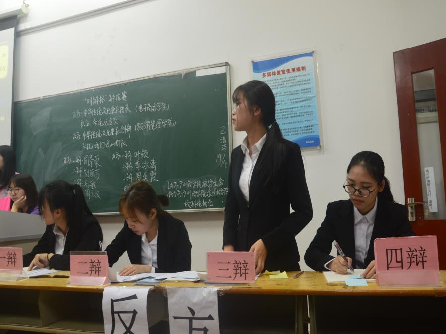 主席宣布开场后,辩论赛初赛第七场正式开始。正方来自电子商务公司——“今晚吃鱼队”——周景荣,刘丽莎,孙敏,周忠汉,他们的观点是“中华传统文化重在传承”,反方来自旅游管理公司——“我们说的都队”——叶颖,李冰清,罗美霞,卢瑜,他们所持的观点是“中华传统文化重在创新”。开篇立论之后,双方进行一对一攻辩,在这一环节,双方三辩和四辩都提出了尖锐的问题,比赛的气氛渐渐升温,场下的观众也在不停的用掌声来为辩手们鼓劲加油。经过了四轮问答之后,正反双方的四辩针对对方辩友的漏洞和不足进行攻辩小结。最激烈的还要数自由辩论环节,辩手们引经据典、旁征博引,运用大量的理论依据,赢得台下观众们的阵阵掌声和欢呼声。最后,恭喜旅游管理公司——“我们说的都队”取得胜利。