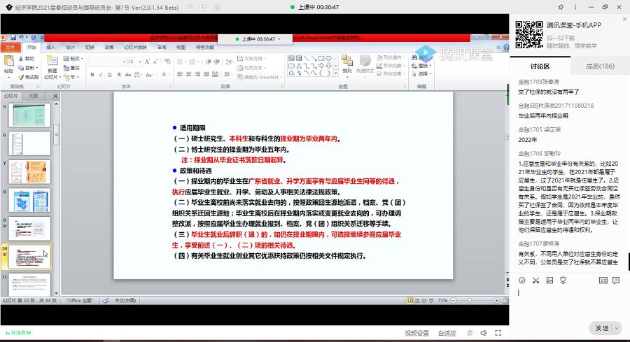 第四部分由2021届三位优秀就业代表分享经验,并积极回答同学的问题。邱厚族同学细心地分享了自己在银行就业过程中的经历与技巧,告诉同学们要根据应聘职位来设计简历,会更有针对性和专业性。廖丽妍同学热心地分享中国人民银行上岸经验,告诉同学们面试过程中的心态与技巧,引导同学们把握好就业机遇。曾小敏同学诚心地分享了国贸专业就业经历,告诉同学们要有清晰的职业规划,同时要敢于尝试、大胆去做。紧接着,张素平辅导员作小结,号召各位毕业生向优秀榜样学习,努力奋斗,在接下来的春招中找到理想的工作。