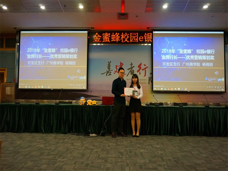 15级金融班杨锦丽同学在2018年3月“建行·金蜜蜂”校园e银行行长工作会议中荣获中国建设银行广东省分行“金蜜蜂”校园e银行金牌行长——优秀营销策划奖。