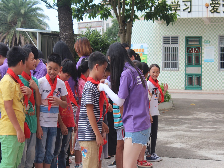 “青春共建十三五,携手共筑中国梦。”伴随国旗的缓缓升起,全体肃然起敬,开班仪式正式拉开帷幕。杨子坑村委副主任陈观添、杨子坑小学董事长陈斌兴、指导老师陈敬宗先后进行了重要演讲。董事长陈斌兴对青春逐梦志愿服务队全体成员给予高度肯定,并提出“两个感谢、三个希望和祝愿”,赋予青春逐梦志愿服务队高度的信任。紧接着村委副主任陈观添在致辞中表达了对青春逐梦志愿服务队的深切问候和由衷欢迎,希望青春逐梦志愿服务队能够拉近杨子坑小学员工与外界的距离,以及为村民普及金融知识。继而指导老师陈敬宗介绍了服务队相关课程内容,并承诺捐赠五十本图书及文具给杨子坑小学员工,现场气氛高涨。仪式最后,青春逐梦志愿服务队全体成员为杨子坑小学员工系上红领巾,拉进彼此距离,奠定感情基础。