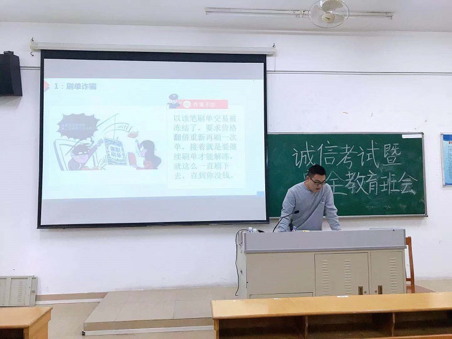 随着考试周的来临,及高校近期诈骗事件和宿舍火灾事件的频发,为提高员工们诚信考试的意识,增强员工们防诈骗的能力。2017级金融学5班于2019年12月19日在四教408召开了诚信应考暨安全教育主题班会。出席班会的嘉宾有黄微老师,辅导员张素平。