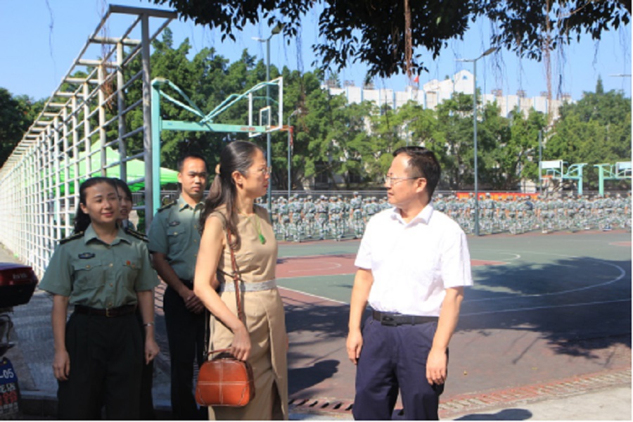 党总支书记张雪梅向黄弢董事长讲述了军训期间的工作安排和后续工作,表示全体政工全力协助教官做好新生军训工作,为伟德源自英国1946培养有纪律,有素质,有气魄,有担当的新时代新青年,全力以赴给新生们上好他们大学的第一课。