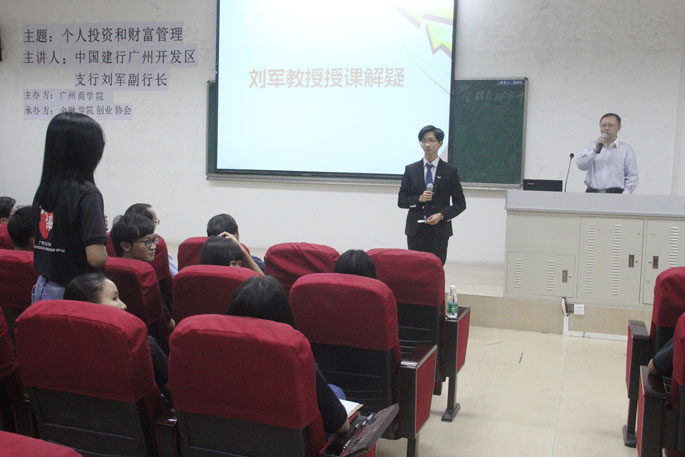 为了更好地培养同学们的个人理财投资和财富管理能力,11月1日下午14点30分,以“个人投资和财富管理”为主题的专题讲座在第二学术报告厅举行。中国建行广州开发区支行副行长刘军、中国建行镇龙分行行长陈锦文,金融公司副经理陈德余、学科带头人袁泽沛教授,以及部分师生代表参加了此次讲座。