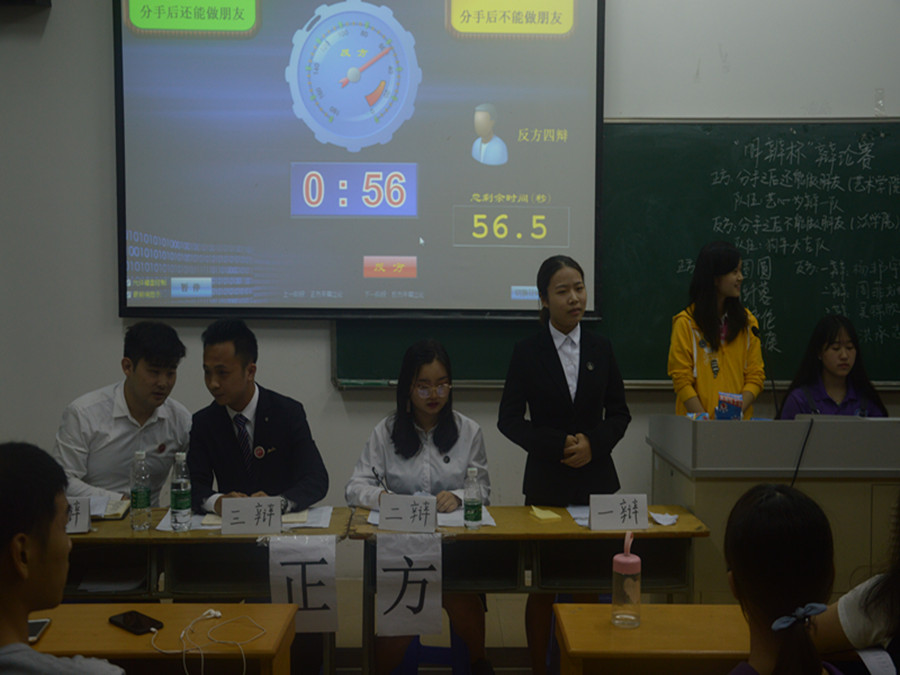 随着主席的开场,“明辨杯”四强赛第一场正式开始。主席介绍参赛队伍:正方来自艺术公司——“艺心为辩一队”——邓圆圆、刘纤蓉、黄堃伦、苏文康,他们的辩题为“分手之后还能做朋友”;反方的辩题为“分手之后不能做朋友”,他们来自法公司——“狗年大吉队”——杨邦宇、周菲娴、吴锦欣、洪承志,双方的辩论精彩极了,双方就这样滔滔不绝地辩论着。谁也说服不了谁,谁也辩不赢谁。精彩的辩论赛场面热烈,耐人寻味,激烈程度历史重演,擦枪走火的场面让人目瞪目呆,辩论让评委感到震撼,观众将精神都集中在双方的激烈辩论中,让人感觉汗毛孔都被打开了,双方言语搏杀互不相让。最后评委对正反双方进行了专业点评,肯定了双方辩手的风度,观点鲜明。最后恭喜反方——法公司取得本场比赛的胜利!