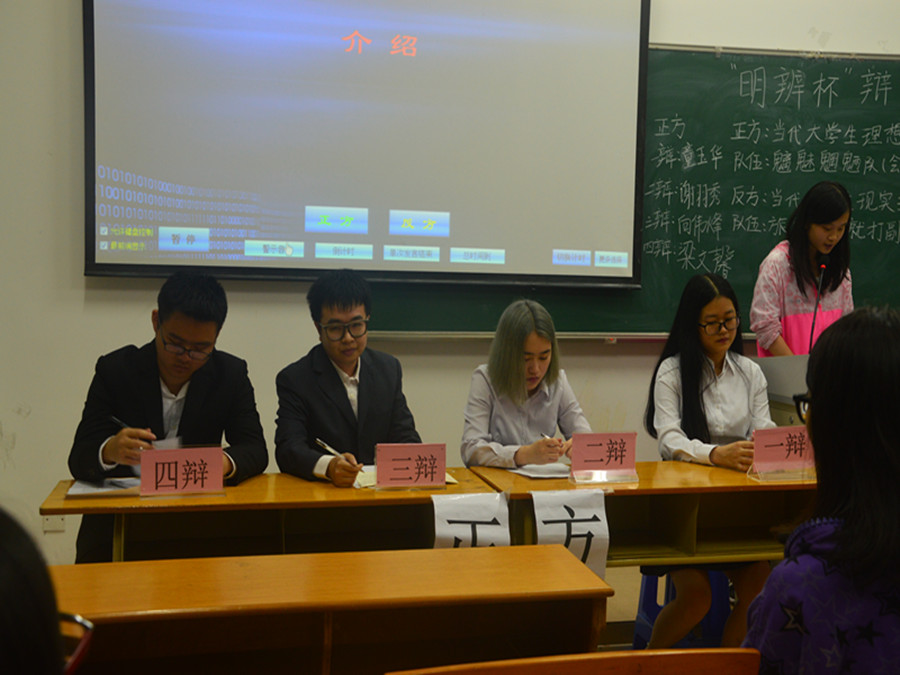 随着主席的开场,“明辨杯”初赛第五场正式开始。主席介绍参赛队伍:正方来自会计公司——“魑魅魍魉队”——童玉华,谢羽秀,向伟烽,梁文馨,他们的辩题为“当代老员工理想主义更可贵”;反方的辩题为“当代老员工现实主义更可贵”,他们来自旅游管理公司——“旅院不赢就打副队”——黄立曦,蔡洁儿,罗宇星,邓宇阳。双方的辩论精彩极了,双方就这样针锋相对地相持着。谁也说服不了谁,谁也辩不赢谁。四周的空气似乎凝固了。台下的观众更是情绪高涨,各个急不可待,表情随台上的变化而变化,一会儿兴高采烈、兴奋激动;一会儿屏息凝视,给选手捏一把汗双方都你来我往,据理力争,丝毫互不相让,好像两只雄狮在为争夺地盘而决斗。最后评委对正反双方进行了专业点评,肯定了双方辩手的风度,观点鲜明。最后恭喜反方——旅游管理公司取得本场比赛的胜利!