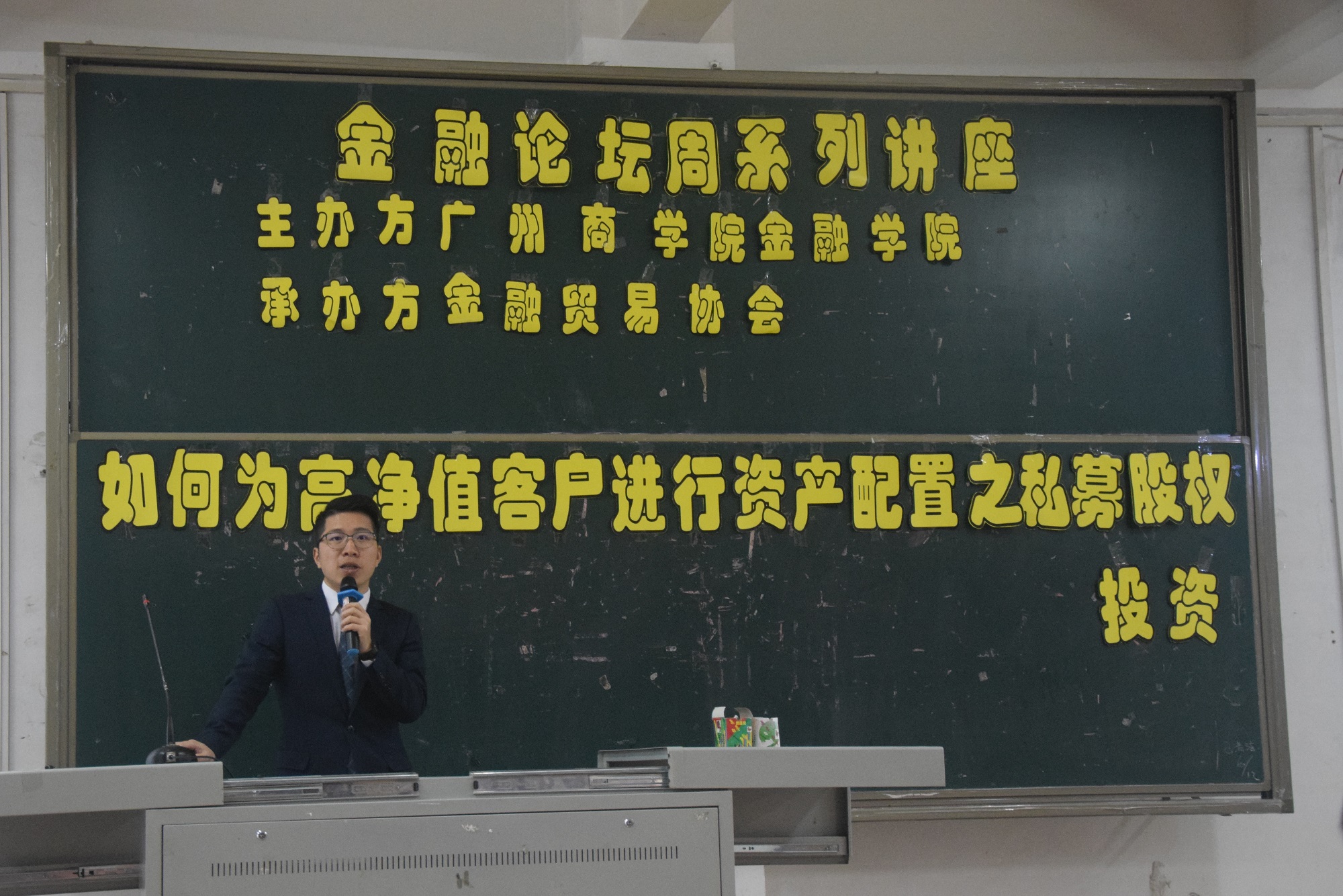 为了让老员工们认识到当前金融市场形势,加强对金融市场的了解,增强老员工的技术分析能力,更好地做到学以致用,为将来从事金融行业工作打好基础。金融公司于2018年12月11日下午在第一教学楼111课室举办了以“如何为高净值客户进行资产配置之私募股权投资”为主题的金融公司第二届论坛周系列讲座,出席本次讲座的领导和嘉宾分别有金融公司经理陈石清教授、北京恒昌汇财投资管理有限公司佛山南海财富中心刘岳强总经理、坤元资产投资管理有限公司区域投资总监张跃振先生、坤元资产投资管理有限公司经理翟研芳女士、金融公司教师姚军老师、杨娜娜老师。