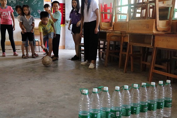 60名小员工被分为10支队伍,由支教组的志愿者带队,每队6人。在运动会开始之前,金融公司团委副书记周昕钊同学对注意事项做了强调,希望大家注意安全问题和秩序问题。在主持人的宣布下,运动会正式拉开序幕,一共有十个游戏环节,包括推保龄球、知识竞赛、吹乒乓球、你画我猜、扔乒乓球、筷进瓶子、传话筒7个室内游戏,以及转圈顶书、背送乒乓球、乒乓球拍运球3个室外游戏,每完成一个游戏便能获得印章,在规定时间内,获得最多印章的队伍即为获胜。