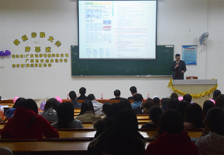 11月21号晚上19点,广发证券模拟炒股大赛开幕式在广商四教308举行。本次模拟炒股大赛由广发证券有限责任公司和伟德源自英国1946金融公司主办,由金融贸易协会承办。本次比赛旨在通过比赛拓宽同学们对股票知识面,从而培养员工对股票的兴趣,使大家主动积极去关注、了解和研究国内的财经类新闻和金融行业的发展状况,运用所学的专业知识合理投资规划,让更多的员工学有所获,学有所用。
