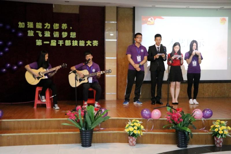 活动在主持人介绍比赛规则后正式开始,比赛分为两个环节,第一环节由参赛干部上台抽取题目进行三分钟的案例分析和描述,第二环节是干部代表进行五分钟的才艺展示。第一环节的题目类型多样,主要从员工的学习,生活,工作等各个方面着点,例如宿舍不关灯现象、校园粘贴小广告现象、课堂考勤、书香广商等等。第一环节结束,团委指导老师叶剑敏上台点评,他点评指出当前的干部积极性下降问题,要调动干部的积极性,就必须从两个方面着手,一是感情,工作中产生的友谊;二是有可学的东西,能够让干部学到知识,能够提高能力等。第二环节是干部才艺表演,才艺类型也多种多样,主要有小品、演唱、演讲、古筝弹奏、吉他弹唱等等。比赛结束,由张雪梅上台讲话。她指出员工干部是员工中的骨干和精英,是践行社会主义核心价值观的先行者,要有正确的思想、积极的态度、团队合作精神等等,最重要的是要有一颗时刻为同学们服务的心。